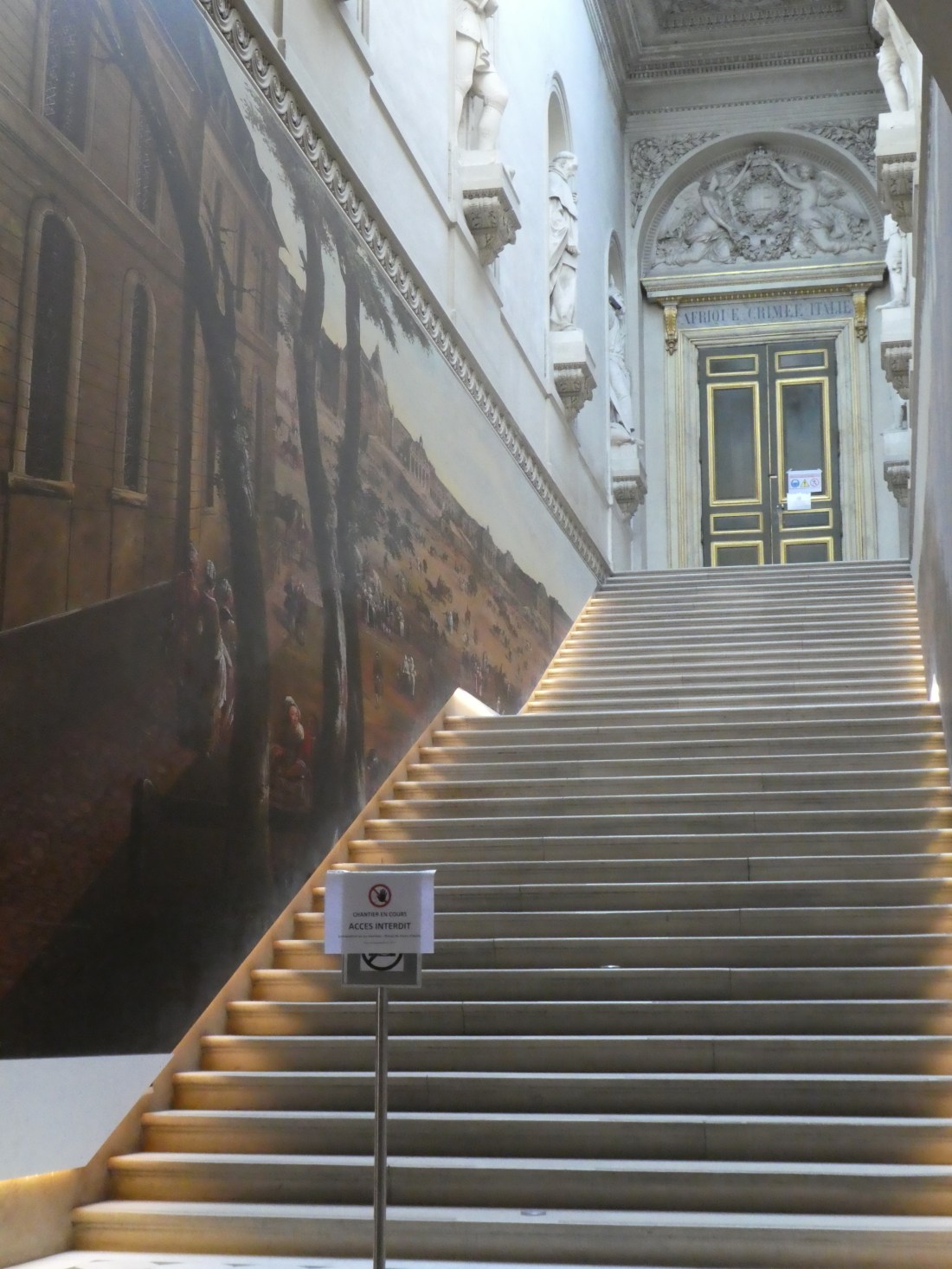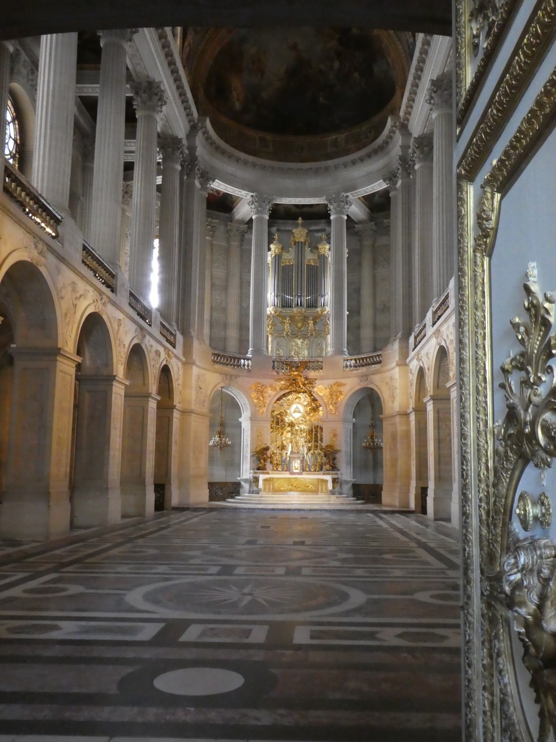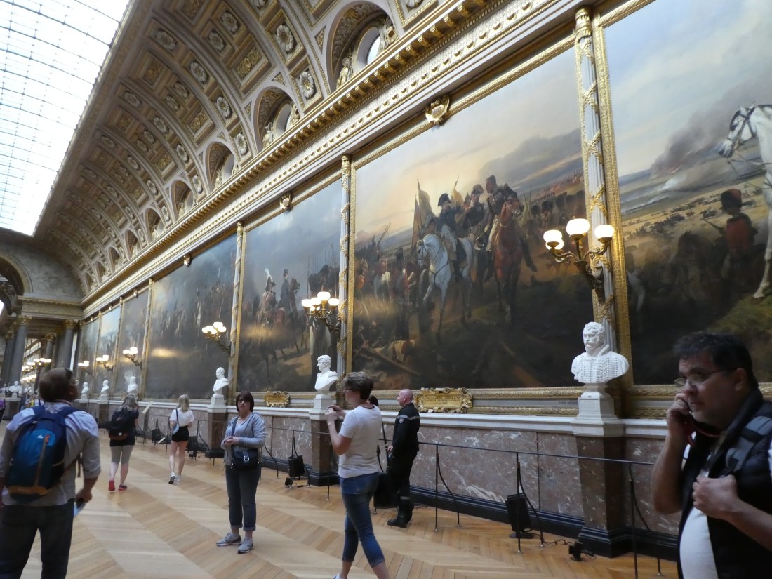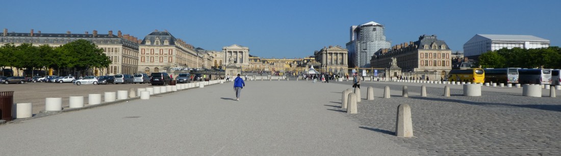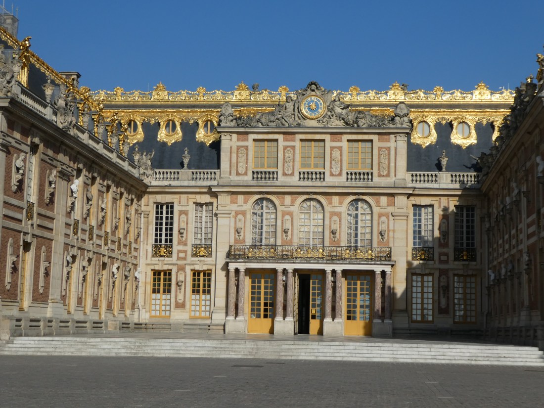 A day trip to Versailles is a very long day. First of all you have to take a train out there. Or 2 trains if you count the first one you took that was going the wrong direction. But it’s a very nice train and, unlike the Metro, it’s above ground so you can see the countryside. Even if you’re going the wrong direction, the scenery is very nice. Everything is so green in the springtime and the countryside is beautiful. It takes about 45 minutes or so to get from Paris to Versailles on the train. Then you have to walk from the train station to the huge cobblestoned grand entrance to the Palace. We already had our tickets in hand for a 9 a.m. entry so that let us skip the ticket line and hordes of people and walk right in at 9 a.m. when they opened. So for a very short time, it felt like we were all alone in the palace. But the hordes caught up to us very quickly.