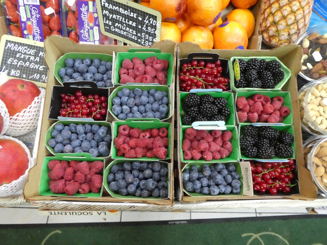 These are very small, shallow boxes of fresh berries and every market has them. According to the latest conversion rates, the raspberries are $5.75, the blueberries are $5.90, the boysenberries are $7.10 and the gooseberries are $9.50.