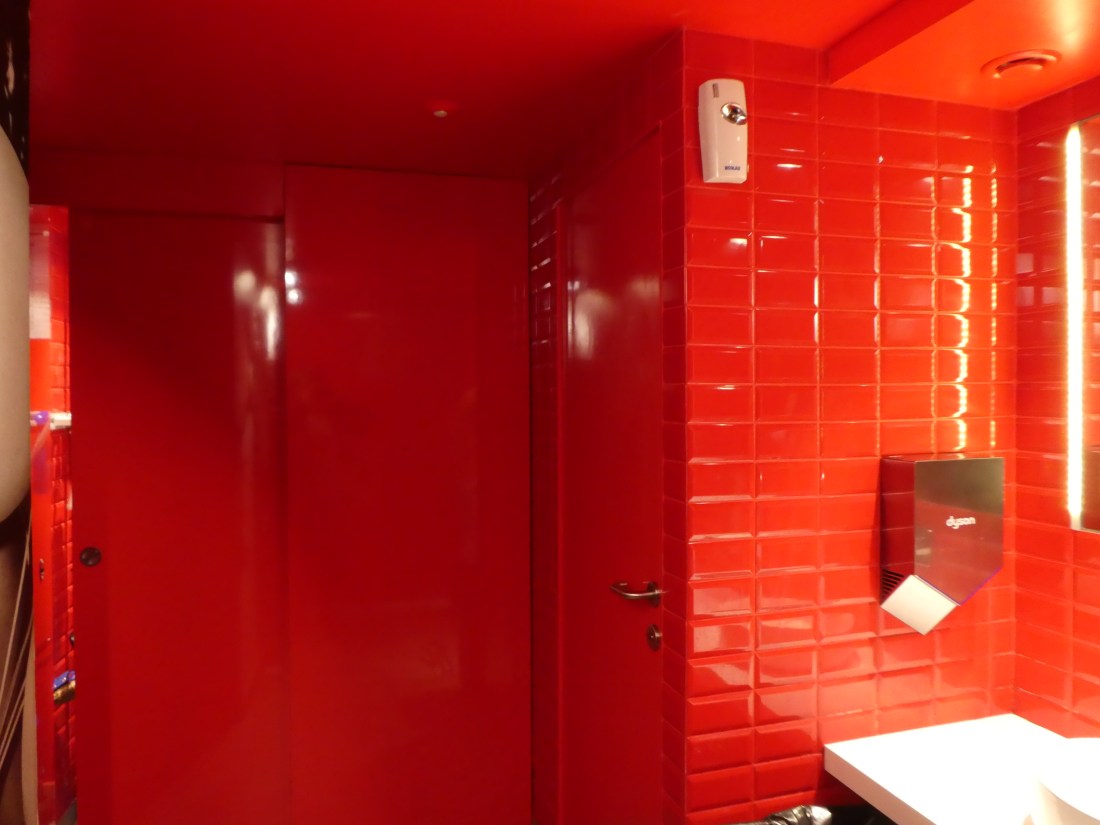 And the toilettes in the Steak and Shake were red, and I do mean RED! The bathrooms in the chain places like this one (and McDonald’s, Five Guys, Burger King, etc.) require a code which is printed on your receipt so that non-customers cannot use them,