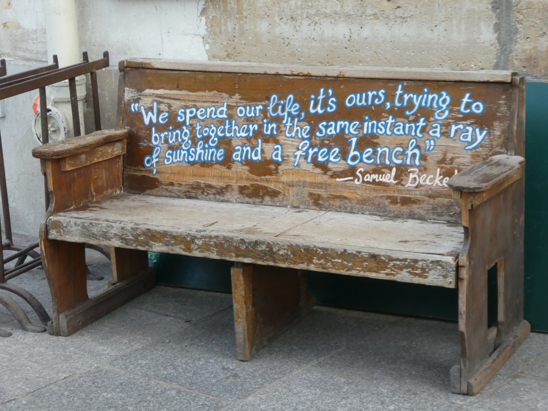 Rick Steves likes this bookstore near our hotel and so did we. It’s a fascinating place. And when the couple on the bench saw me taking photos, they stood up so I could take a photo of the bench too (below).