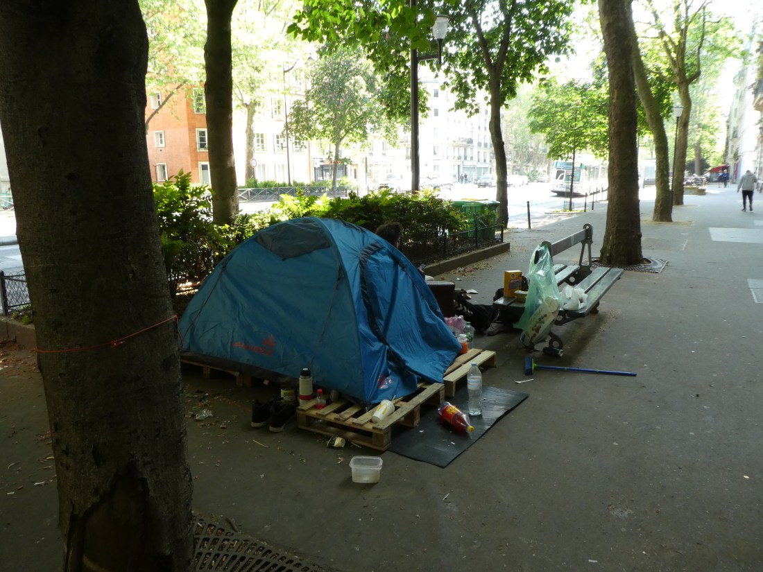 Last time we were in Paris, we saw only one homeless man. This time we saw many of them, some of them in tents like this one that seemed to be well stocked. As we walked by, we could tell he was watching TV inside.