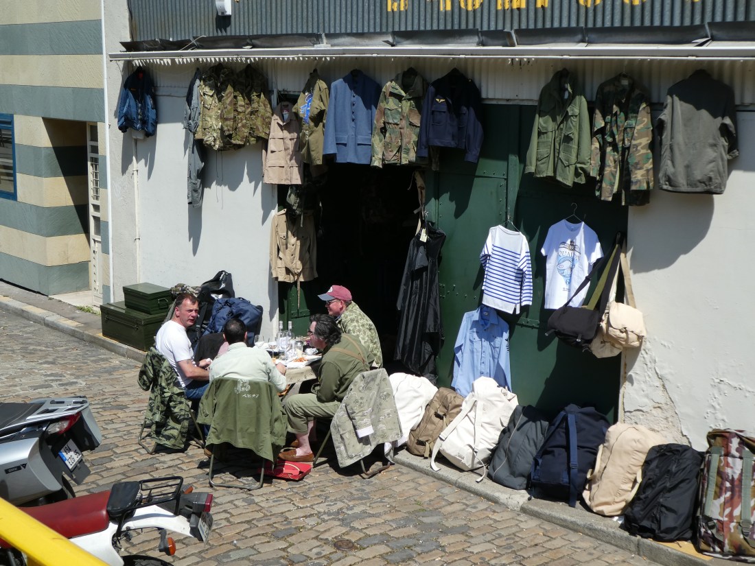 When we were here 2 years ago and left from the Atlantic Garden, we ran across this exact same sight – 4 guys who work at the military surplus store (I think) having lunch (complete with wine) at a table in the driveway next to the store. It was like deja vu all over again (to quote Yogi Berra).
