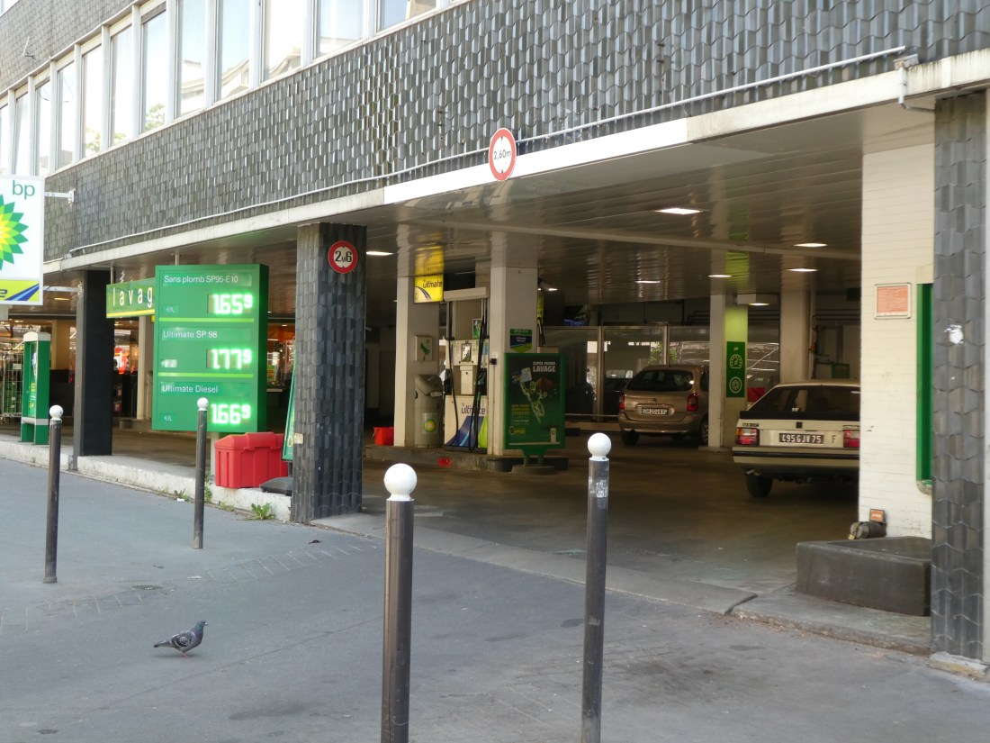 This is the biggest gas station I’ve ever seen. Most gas stations are one parallel parking space next to one gas pump on the sidewalk. But this one is huge. It even has posts that guide you across the sidewalk and into the station and it has a mini-mart inside (behind the big green price sign).