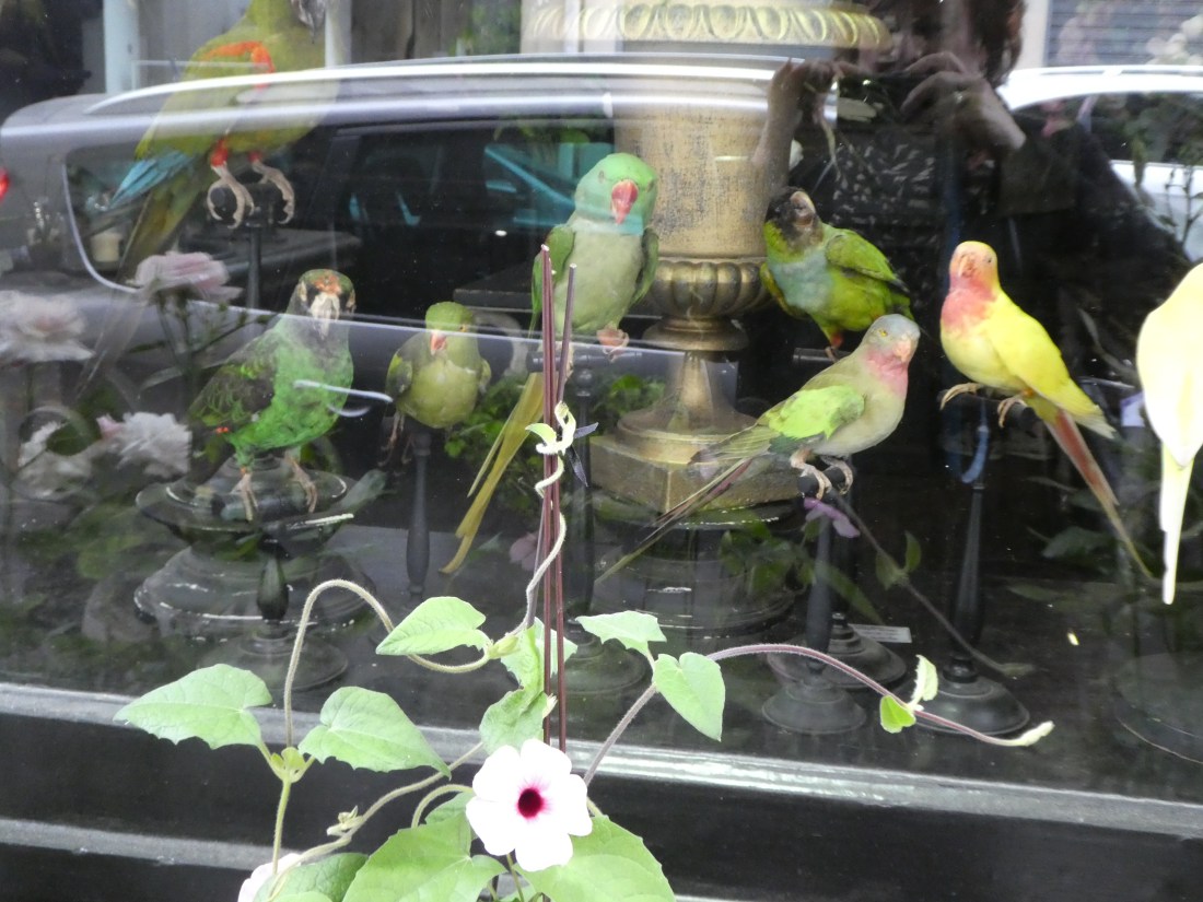 In the window of a flower shop. None of these birds is real!