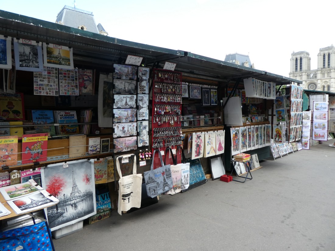 We love the stalls on the right bank and the left bank (above) of the river. They all carry pretty much the same merchandise yet each is just a little different. Mostly they had vintage books, magazines, photos, and prints, and current souvenirs such as post cards, placemats, tote bags, keychains, jewelry, etc. I think the ones on the right bank had more original art by local artists.